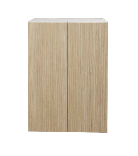 Armoire de cuisine de style moderne. Boîtier en mélamine blanche de 5/8 po. Unité pré-assemblée et prête à installer. Porte en mélamine au fini grain de bois. Charnières à fermeture douce.